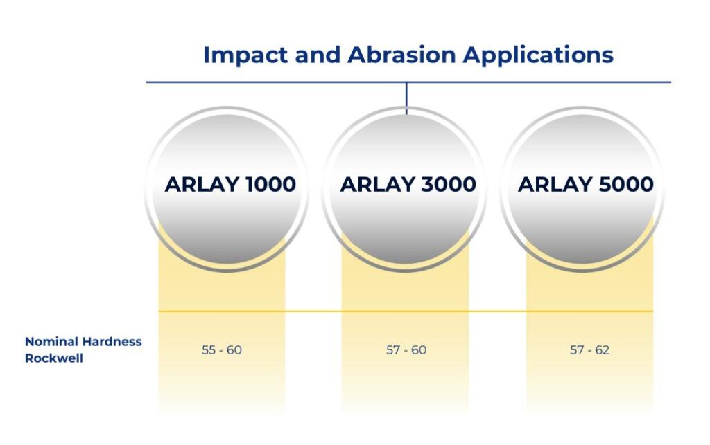ARLAY Chromium Carbide Overlay (CCO) Wear Plate is an extra hard weld clad plate with alloys that give higher abrasion resistance in high stress applications with moderate to low impact conditions. ARLAY wear plates contain primary M7C3 carbides with a hardness of 55-60 Hrc having 30% carbides.