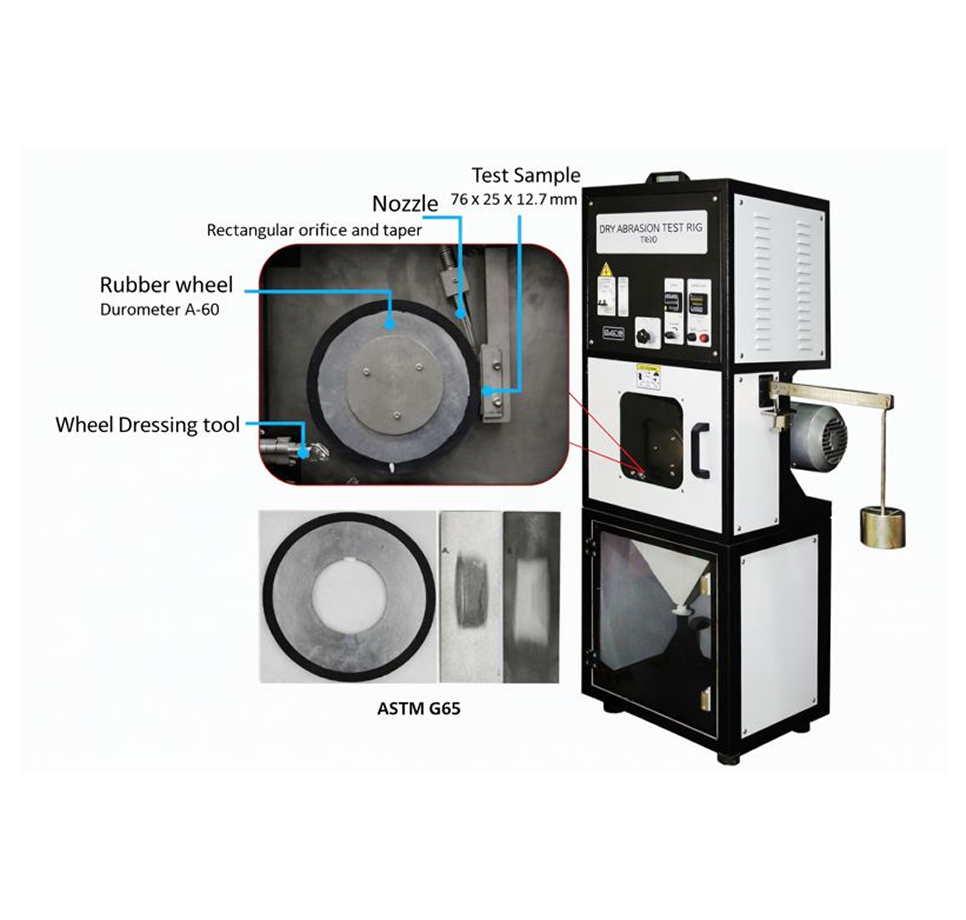 The ASTM G65 test simulates sliding abrasion conditions under moderate pressure, using dry sand metered between a rubber wheel and a block coupon of the material being evaluated. The test allows comparison of wear-resistant materials by their volume loss in cubic millimetres, with materials of higher wear resistance showing lower volume loss.